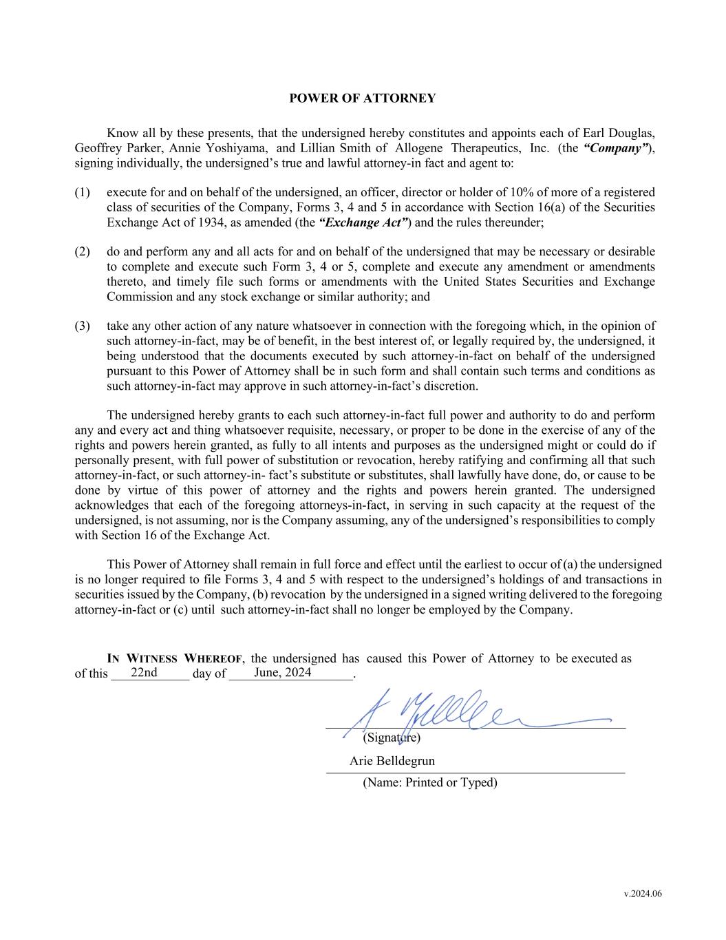 v.2024.06 POWER OF ATTORNEY Know all by these presents, that the undersigned hereby constitutes and appoints each of Earl Douglas, Geoffrey Parker, Annie Yoshiyama, and Lillian Smith of Allogene Therapeutics, Inc. (the “Company”), signing individually, the undersigned’s true and lawful attorney-in fact and agent to: (1) execute for and on behalf of the undersigned, an officer, director or holder of 10% of more of a registered class of securities of the Company, Forms 3, 4 and 5 in accordance with Section 16(a) of the Securities Exchange Act of 1934, as amended (the “Exchange Act”) and the rules thereunder; (2) do and perform any and all acts for and on behalf of the undersigned that may be necessary or desirable to complete and execute such Form 3, 4 or 5, complete and execute any amendment or amendments thereto, and timely file such forms or amendments with the United States Securities and Exchange Commission and any stock exchange or similar authority; and (3) take any other action of any nature whatsoever in connection with the foregoing which, in the opinion of such attorney-in-fact, may be of benefit, in the best interest of, or legally required by, the undersigned, it being understood that the documents executed by such attorney-in-fact on behalf of the undersigned pursuant to this Power of Attorney shall be in such form and shall contain such terms and conditions as such attorney-in-fact may approve in such attorney-in-fact’s discretion. The undersigned hereby grants to each such attorney-in-fact full power and authority to do and perform any and every act and thing whatsoever requisite, necessary, or proper to be done in the exercise of any of the rights and powers herein granted, as fully to all intents and purposes as the undersigned might or could do if personally present, with full power of substitution or revocation, hereby ratifying and confirming all that such attorney-in-fact, or such attorney-in- fact’s substitute or substitutes, shall lawfully have done, do, or cause to be done by virtue of this power of attorney and the rights and powers herein granted. The undersigned acknowledges that each of the foregoing attorneys-in-fact, in serving in such capacity at the request of the undersigned, is not assuming, nor is the Company assuming, any of the undersigned’s responsibilities to comply with Section 16 of the Exchange Act. This Power of Attorney shall remain in full force and effect until the earliest to occur of (a) the undersigned is no longer required to file Forms 3, 4 and 5 with respect to the undersigned’s holdings of and transactions in securities issued by the Company, (b) revocation by the undersigned in a signed writing delivered to the foregoing attorney-in-fact or (c) until such attorney-in-fact shall no longer be employed by the Company. IN WITNESS WHEREOF, the undersigned has caused this Power of Attorney to be executed as of this ____________ day of ___________________. ______________________________________________ (Signature) (Name: Printed or Typed) 22nd June, 2024 Arie Belldegrun