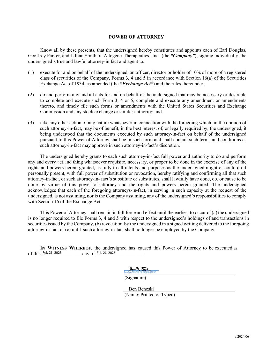 v.2024.06 POWER OF ATTORNEY Know all by these presents, that the undersigned hereby constitutes and appoints each of Earl Douglas, Geoffrey Parker, and Lillian Smith of Allogene Therapeutics, Inc. (the “Company”), signing individually, the undersigned’s true and lawful attorney-in fact and agent to: (1) execute for and on behalf of the undersigned, an officer, director or holder of 10% of more of a registered class of securities of the Company, Forms 3, 4 and 5 in accordance with Section 16(a) of the Securities Exchange Act of 1934, as amended (the “Exchange Act”) and the rules thereunder; (2) do and perform any and all acts for and on behalf of the undersigned that may be necessary or desirable to complete and execute such Form 3, 4 or 5, complete and execute any amendment or amendments thereto, and timely file such forms or amendments with the United States Securities and Exchange Commission and any stock exchange or similar authority; and (3) take any other action of any nature whatsoever in connection with the foregoing which, in the opinion of such attorney-in-fact, may be of benefit, in the best interest of, or legally required by, the undersigned, it being understood that the documents executed by such attorney-in-fact on behalf of the undersigned pursuant to this Power of Attorney shall be in such form and shall contain such terms and conditions as such attorney-in-fact may approve in such attorney-in-fact’s discretion. The undersigned hereby grants to each such attorney-in-fact full power and authority to do and perform any and every act and thing whatsoever requisite, necessary, or proper to be done in the exercise of any of the rights and powers herein granted, as fully to all intents and purposes as the undersigned might or could do if personally present, with full power of substitution or revocation, hereby ratifying and confirming all that such attorney-in-fact, or such attorney-in- fact’s substitute or substitutes, shall lawfully have done, do, or cause to be done by virtue of this power of attorney and the rights and powers herein granted. The undersigned acknowledges that each of the foregoing attorneys-in-fact, in serving in such capacity at the request of the undersigned, is not assuming, nor is the Company assuming, any of the undersigned’s responsibilities to comply with Section 16 of the Exchange Act. This Power of Attorney shall remain in full force and effect until the earliest to occur of (a) the undersigned is no longer required to file Forms 3, 4 and 5 with respect to the undersigned’s holdings of and transactions in securities issued by the Company, (b) revocation by the undersigned in a signed writing delivered to the foregoing attorney-in-fact or (c) until such attorney-in-fact shall no longer be employed by the Company. IN WITNESS WHEREOF, the undersigned has caused this Power of Attorney to be executed as of this ________________ day of ___________________. _____________________________________________ (Signature) Ben Beneski (Name: Printed or Typed) Ben Beneski (Feb 26, 2025 12:14 PST) Feb 26, 2025 Feb 26, 2025