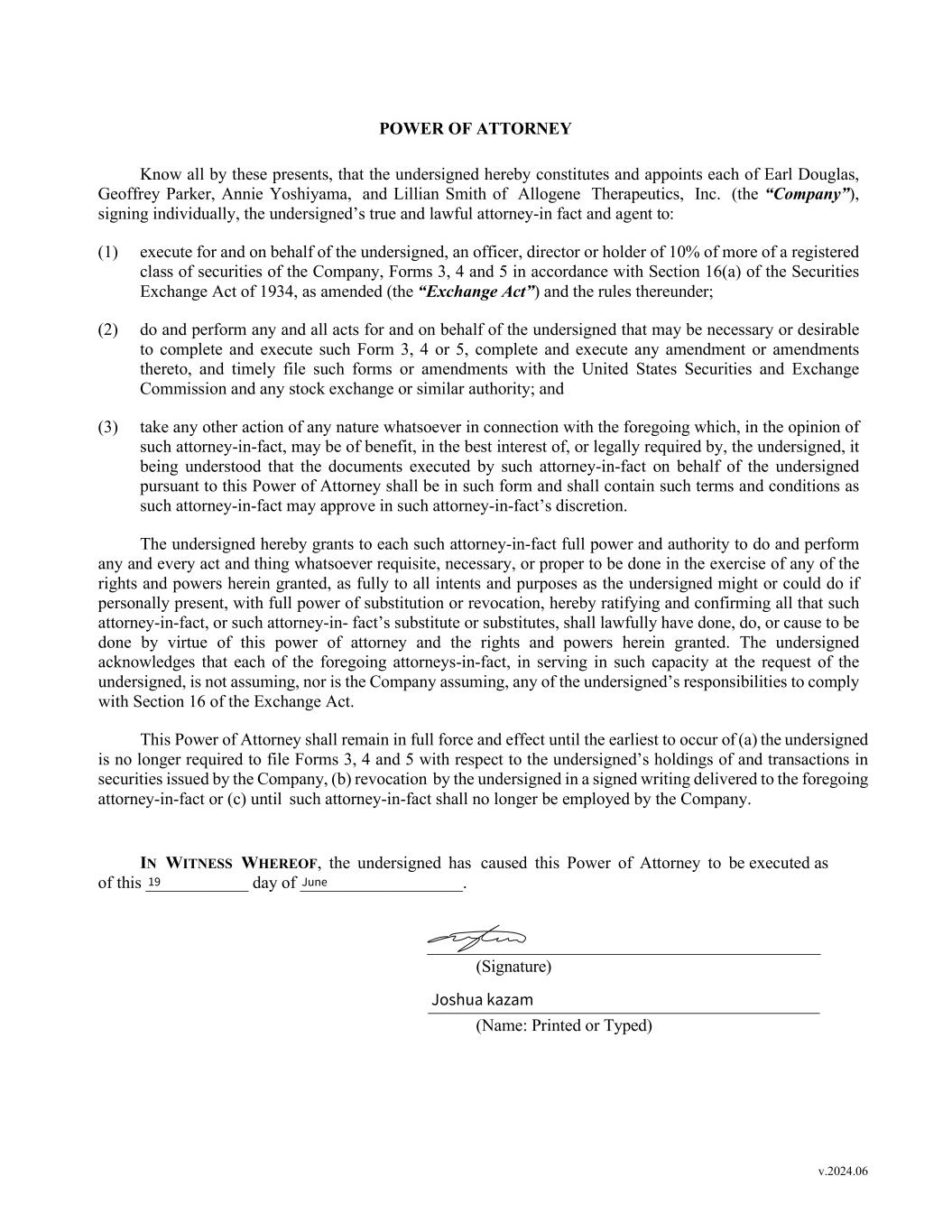 v.2024.06 POWER OF ATTORNEY Know all by these presents, that the undersigned hereby constitutes and appoints each of Earl Douglas, Geoffrey Parker, Annie Yoshiyama, and Lillian Smith of Allogene Therapeutics, Inc. (the “Company”), signing individually, the undersigned’s true and lawful attorney-in fact and agent to: (1) execute for and on behalf of the undersigned, an officer, director or holder of 10% of more of a registered class of securities of the Company, Forms 3, 4 and 5 in accordance with Section 16(a) of the Securities Exchange Act of 1934, as amended (the “Exchange Act”) and the rules thereunder; (2) do and perform any and all acts for and on behalf of the undersigned that may be necessary or desirable to complete and execute such Form 3, 4 or 5, complete and execute any amendment or amendments thereto, and timely file such forms or amendments with the United States Securities and Exchange Commission and any stock exchange or similar authority; and (3) take any other action of any nature whatsoever in connection with the foregoing which, in the opinion of such attorney-in-fact, may be of benefit, in the best interest of, or legally required by, the undersigned, it being understood that the documents executed by such attorney-in-fact on behalf of the undersigned pursuant to this Power of Attorney shall be in such form and shall contain such terms and conditions as such attorney-in-fact may approve in such attorney-in-fact’s discretion. The undersigned hereby grants to each such attorney-in-fact full power and authority to do and perform any and every act and thing whatsoever requisite, necessary, or proper to be done in the exercise of any of the rights and powers herein granted, as fully to all intents and purposes as the undersigned might or could do if personally present, with full power of substitution or revocation, hereby ratifying and confirming all that such attorney-in-fact, or such attorney-in- fact’s substitute or substitutes, shall lawfully have done, do, or cause to be done by virtue of this power of attorney and the rights and powers herein granted. The undersigned acknowledges that each of the foregoing attorneys-in-fact, in serving in such capacity at the request of the undersigned, is not assuming, nor is the Company assuming, any of the undersigned’s responsibilities to comply with Section 16 of the Exchange Act. This Power of Attorney shall remain in full force and effect until the earliest to occur of (a) the undersigned is no longer required to file Forms 3, 4 and 5 with respect to the undersigned’s holdings of and transactions in securities issued by the Company, (b) revocation by the undersigned in a signed writing delivered to the foregoing attorney-in-fact or (c) until such attorney-in-fact shall no longer be employed by the Company. IN WITNESS WHEREOF, the undersigned has caused this Power of Attorney to be executed as of this ____________ day of ___________________. ______________________________________________ (Signature) (Name: Printed or Typed) 19 June Joshua kazam